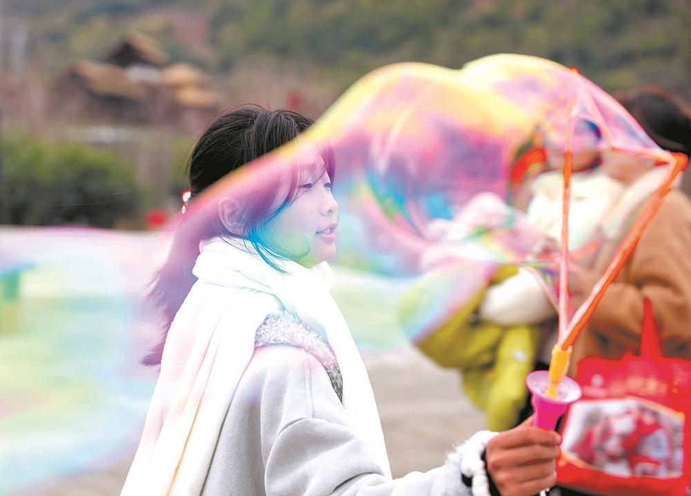 2月18日,南平市政和县石圳景区,市民们走出家门来到户外赏景、嬉戏、休憩,品尝美食,乐享年味。(黄杰敏 摄)
