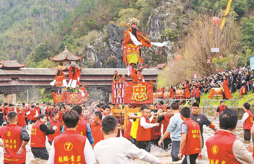 3日,龙岩市连城县罗坊乡走古事现场锣鼓震天,乡亲们抬着400余斤的古事冲入青岩河,呐喊着踏浪逆进。(通讯员 池啟浪 见习记者 李娟 摄)