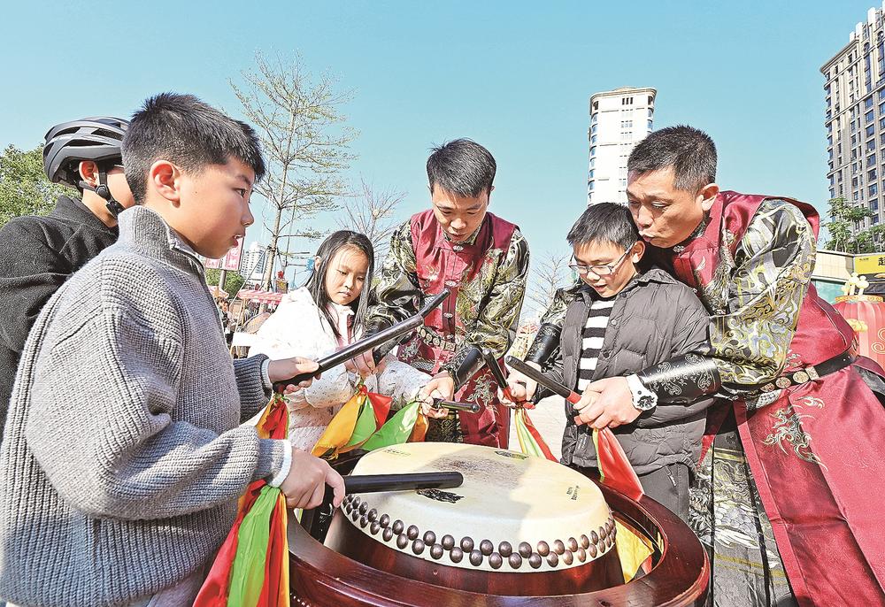 图为小朋友体验非遗“太平鼓”。(记者 游庆辉 摄影报道)