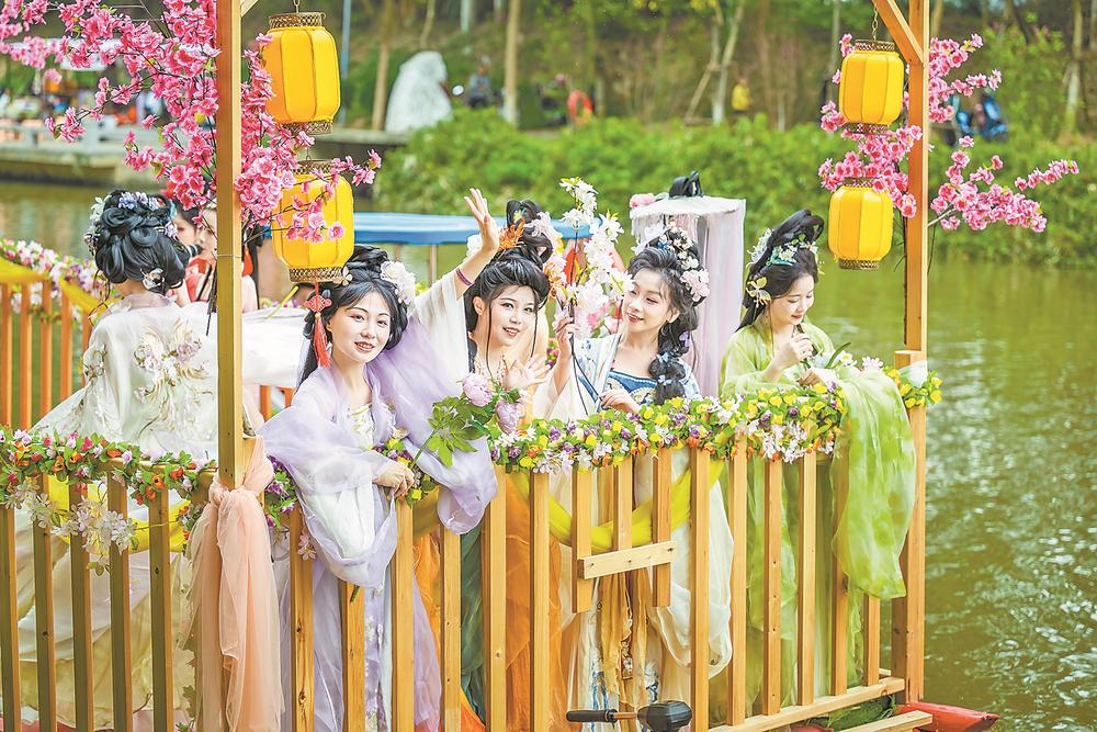 近日,“桃醉春光·华裳雅集”暨十里桃源三月桃花节活动在厦门市翔安区内厝镇十里桃源景区举行。日间的花船巡游、国潮市集,夜间的水上演出、灯光花船……3月14日至4月20日,每个周末这里都将轮番呈现不同的春日雅趣,为市民游客奉上一场场沉浸式的春光盛会。景区还特别推出限定“桃花宴”及花间茶铺活动,让春日的滋味在舌尖绽放。图为十里桃源景区内举行的汉服花船巡游。(陈瑞坤 摄影报道)