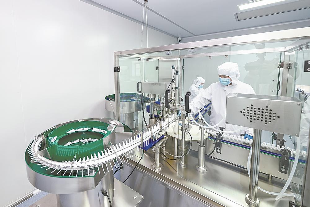 近日,位于福州新区元洪功能区的福建长太生物科技有限公司里,工人正在自主研发、新近投产的抑菌液产品生产线上调试机器。作为一家集研发、生产于一体的新型海洋生物科技企业,近年来,长太生物积极推动以食品、药品、保健品为核心的三产融合发展,成为福州海洋新质生产力发展的“生力军”之一。(记者 施辰静 摄)