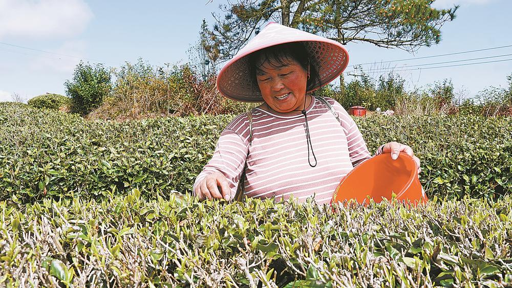 麒麟山茶业基地工人在采摘春茶。
