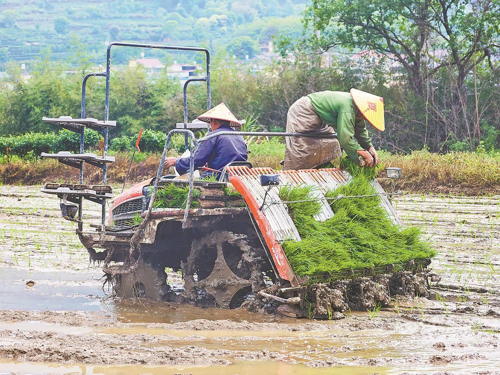 近日,在松溪县茶平乡的水田里,农户驾驶插秧机将嫩绿的秧苗种进田里。近年来,松溪大力推进农业机械化、智能化、低碳化转型,推动传统农业向绿色高效方向转变。(通讯员 李梦凌 记者 陈黎慰 摄)