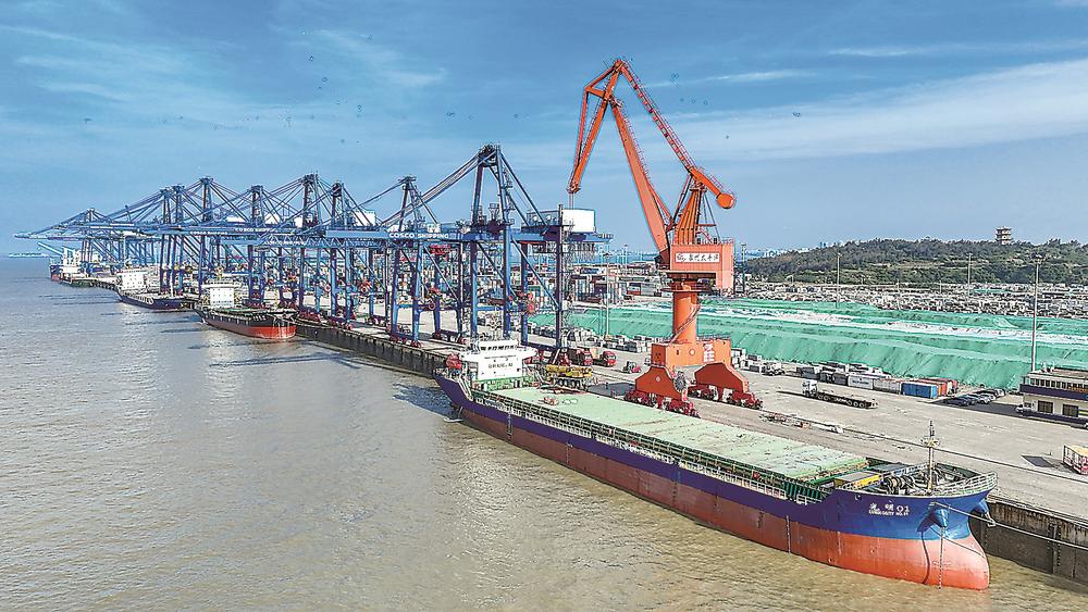 20日,“光明01”轮装载着6654件、重达2822.8吨的工程车辆、发电机组和机械设备,从泉州港石湖港区启航前往冈比亚班珠尔港。此次出口是福建口岸首次采用自航出口船舶“带货交付”模式。图为“光明01”轮靠泊在泉州港作业。(记者 黄琼芬 通讯员 范英帅 林劲峰 摄)