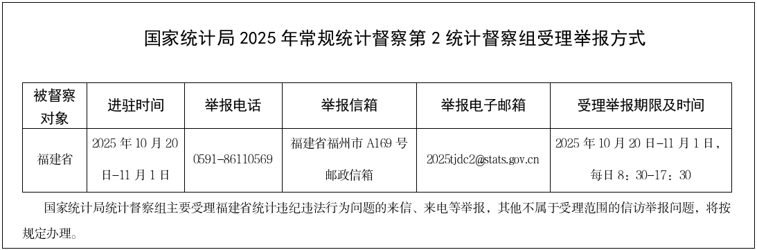 为深入贯彻落实习近平总书记关于统计工作的重要讲话和重要指示批示精神,根据党中央和国务院授权,国家统计局2025年常规统计督察第2统计督察组日前进驻福建省开展统计督察工作,实地督察时间13天左右。