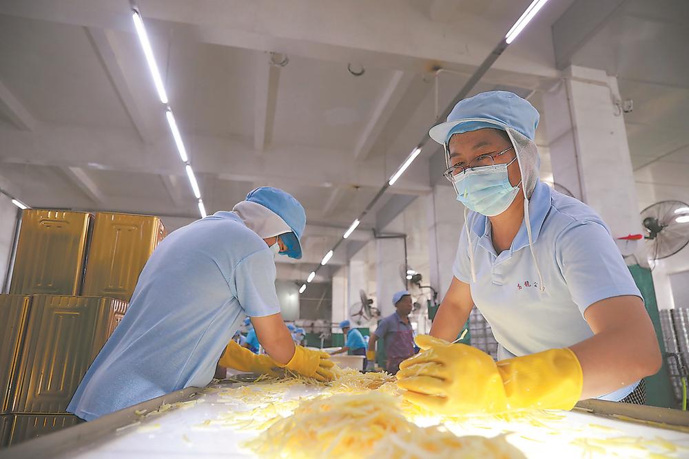 农户的腰包鼓了,种植的积极性也越来越高。“原材料由农户直供,不仅能做到无公害、可追溯,还方便与农户开展种植技术上的交流合作,进一步提高原料和产品的品质。”明成食品有限公司副总经理罗茂清介绍,“我们有5个车间,可以根据客户的需求加工不同规格的产品。”