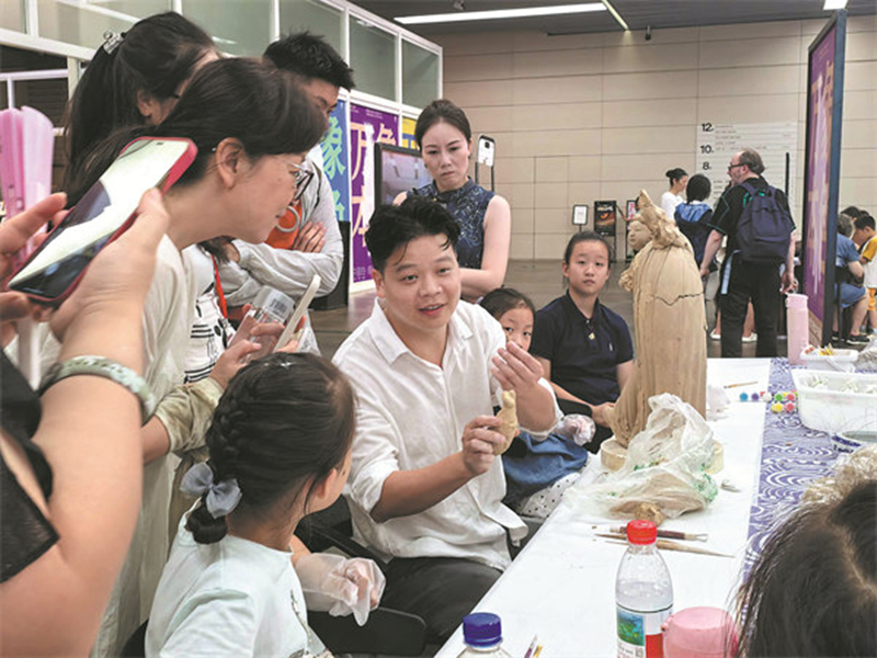 Li Zhanggao (middle, sitting), a porcelain artist from Dehua, Fujian province, shares the craft with visitors to the China Art Museum, Shanghai. [Photo provided to China Daily]