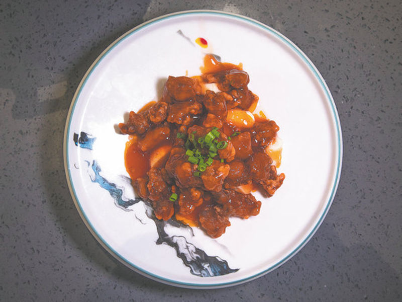 "The cuts must be two-thirds deep. When it's fried, it curls up like lychee fruit. The meat needs to be both lean and fat, then lightly coated with starch, so the 'lychee skin' pattern shows through the sweet-and-sour glaze," he says.