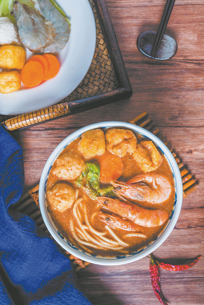 Signature dishes include lychee pork (top center), satay noodles (top left), fish balls (above) and oyster omelet (right). [Photo provided to China Daily]