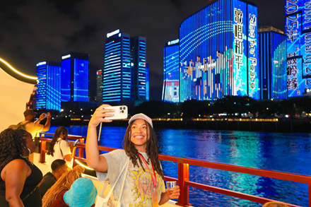 The US prticipants soak in the shimmering nightscape of the Minjiang River.