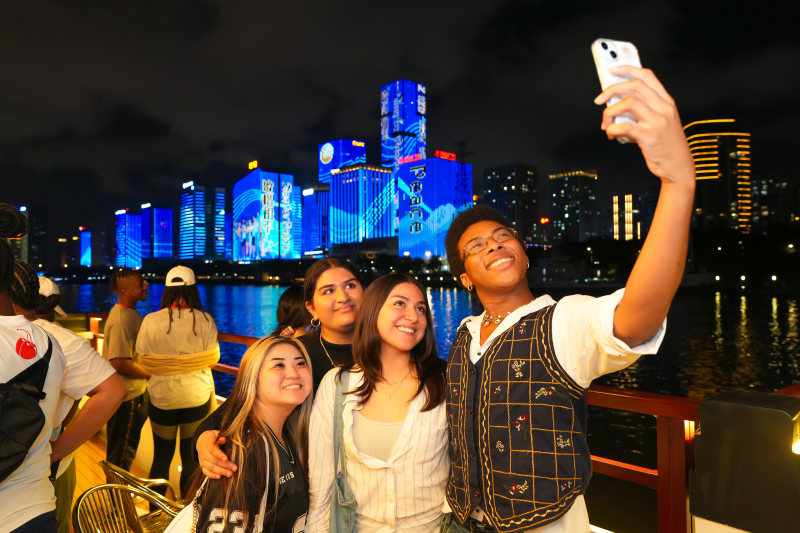 American participants take selfies aboard a cruise ship, with the illuminated slogan "Sing for Peace"—the theme of the Bond with Kuliang: 2025 China-U.S. Youth Choir Festival—glowing on a distant building. [Photo provided to bondwithkuliang.org.cn]