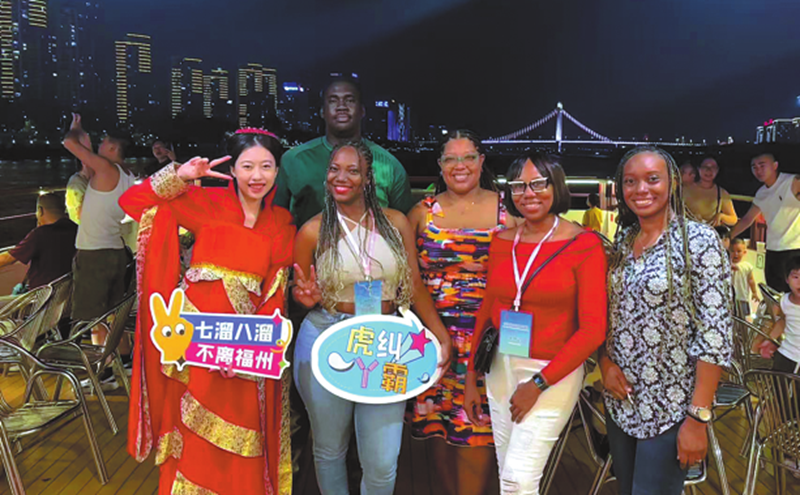 Tourists from home and abroad pose for a photo during a night cruise along Minjiang River in Fuzhou in September. CHINA DAILY