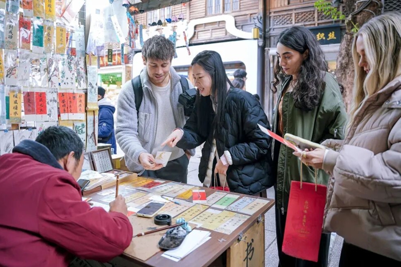 Influencers watch a Chinese calligraphy demonstration at Fuzhou's Three Lanes and Seven Alleys. [Photo provided to chinadaily.com.cn]