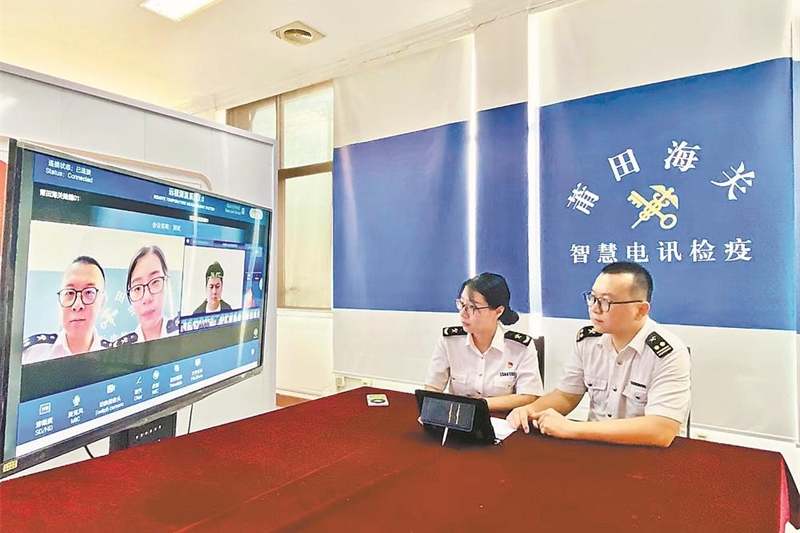 Putian Customs officers conduct inbound vessel inspections using the smart tele-inspection system. [Photo provided to chinadaily.com.cn]
