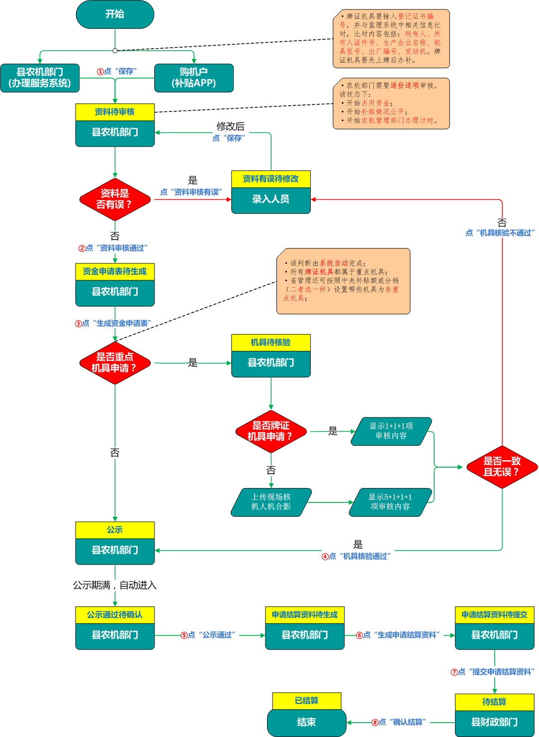 (3)县级农机化主管部门受理补贴申请、审核补贴申请材料、核验补贴机具并对外公示;