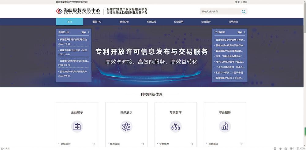 记者登录福建省知识产权交易服务平台网站,打开“专利开放许可信息发布与交易服务”页面,就进入专利开放许可专区,企业和科研单位都可以在此浏览当前专利开放许可情况……自去年10月起,相关单位或科研人员可在该平台集中发布专利开放许可信息,促成专利更多更快更好向中小企业转化。