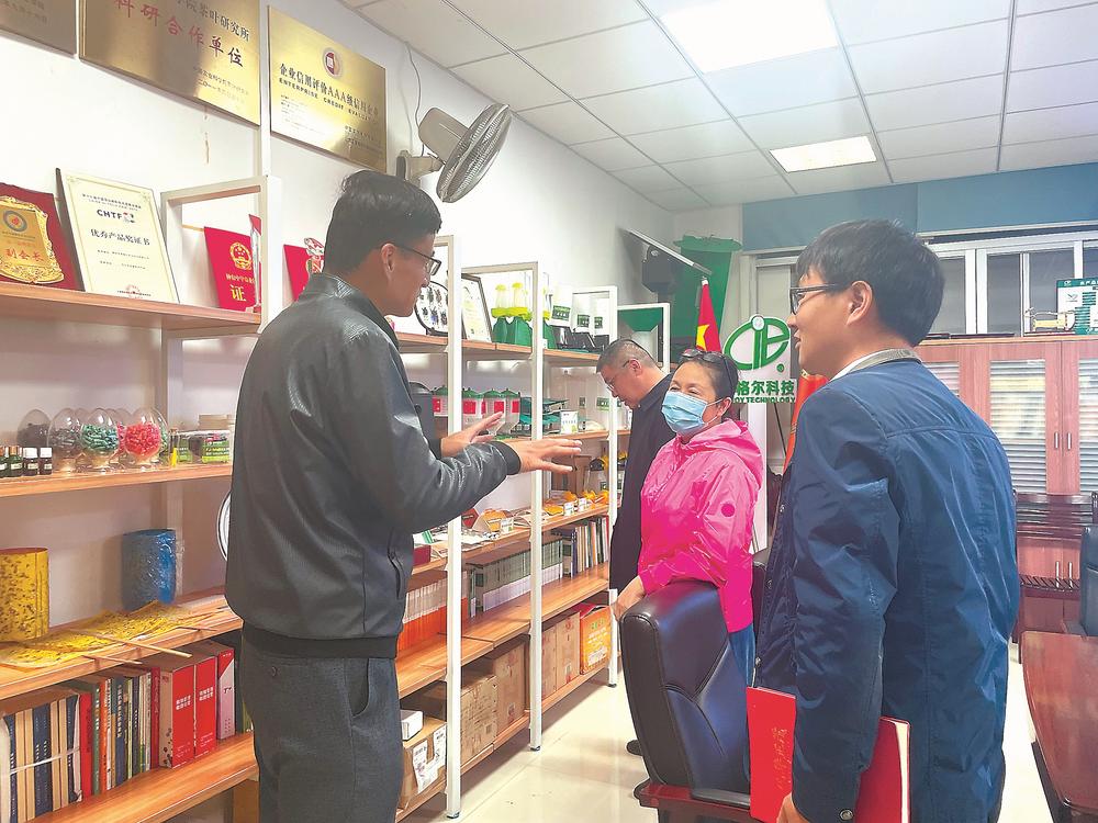 漳州市英格尔农业科技有限公司相关负责人在平台上获知漳州卫生职业学院药学系教师丁其春(左一)的专利成果,立即与其联系洽谈。(受访者供图)