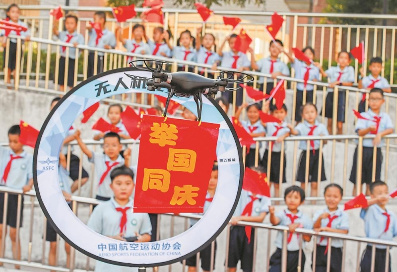 9月28日,泉州市泉港区益海实验小学开展“我为祖国送祝福”主题教育。图为无人机兴趣班的孩子用展示无人机穿越障碍的方式迎接国庆。(通讯员 林弘梫 摄)