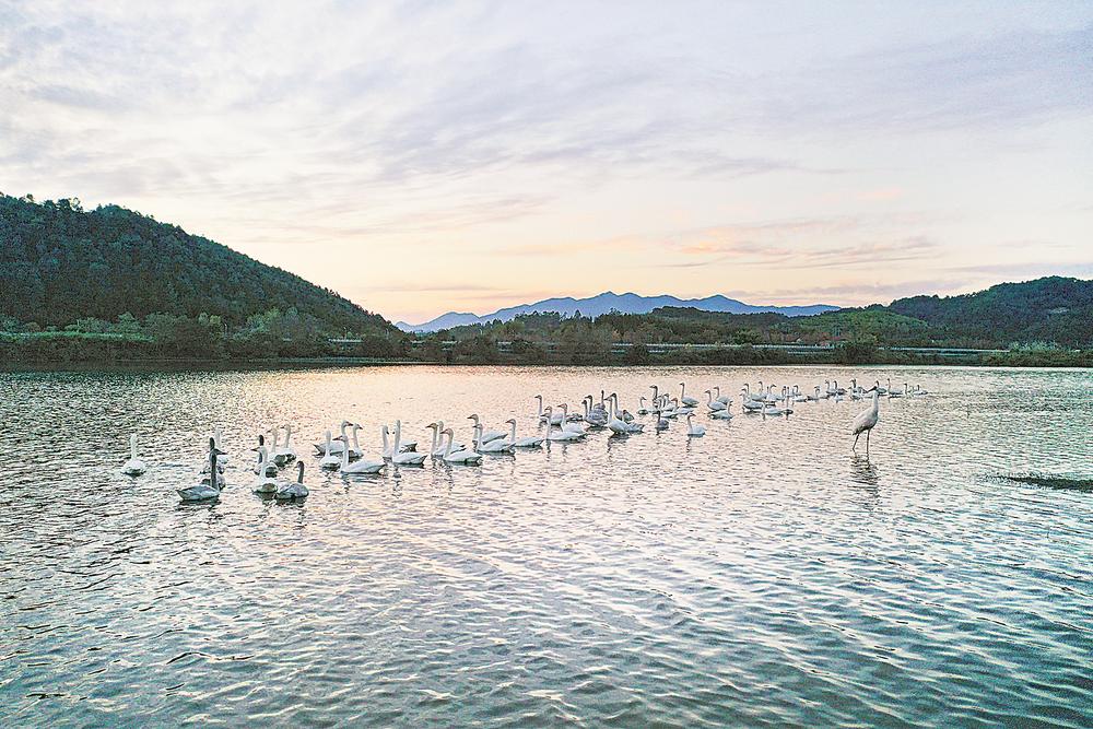 近日,在南平市建阳区将口镇山尾路与滨江西路交接的武夷山国家公园一号风景道旁,一群小天鹅在水清岸绿的崇阳溪上栖息嬉戏。