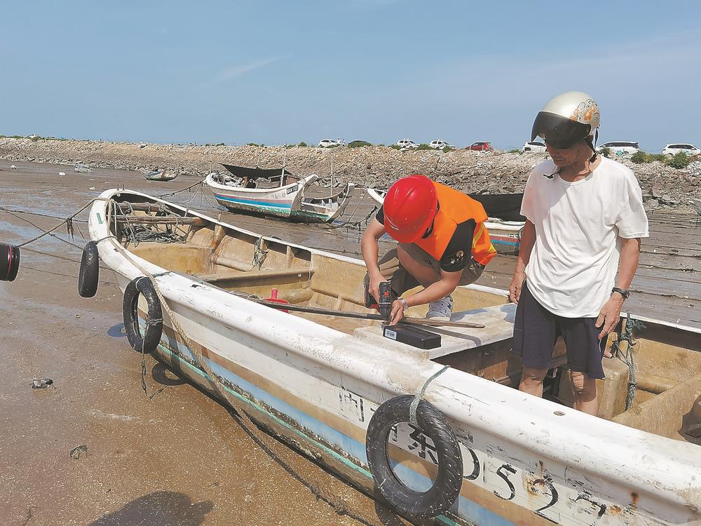莆田市公安局北岸分局民警和市数字办工作人员指导渔民安装北斗三号定位仪。(资料图片)