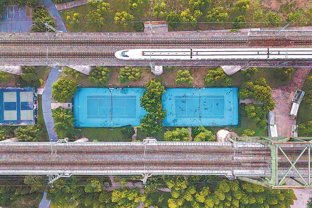 8月16日,福州榕华网球公园,因其位于高铁高架桥下的独特地理位置,吸引了不少网球爱好者前来运动打卡。陈天博 摄