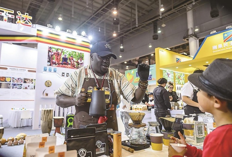 厦门咖啡展国际展区全方位呈现全球咖啡产业的多元风貌。图为乌干达展位上,展商正在邀请来宾品尝咖啡。
