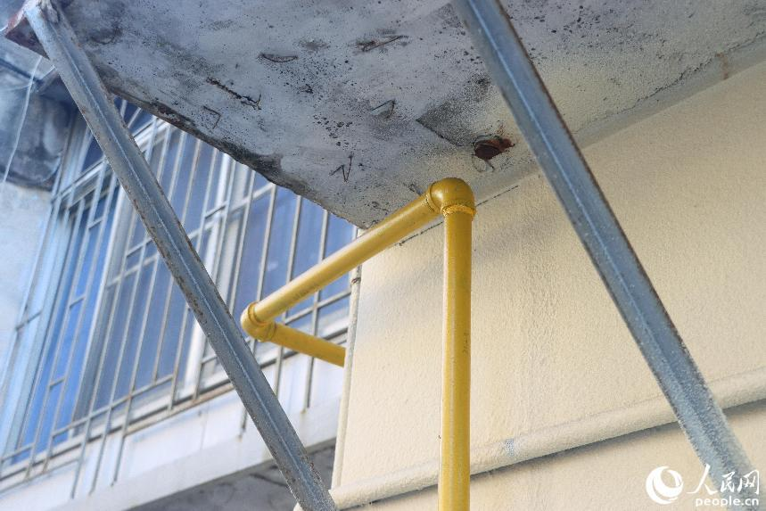 黄色的新管道与曾经从户内穿过的旧管道痕迹。人民网 林铭贤摄