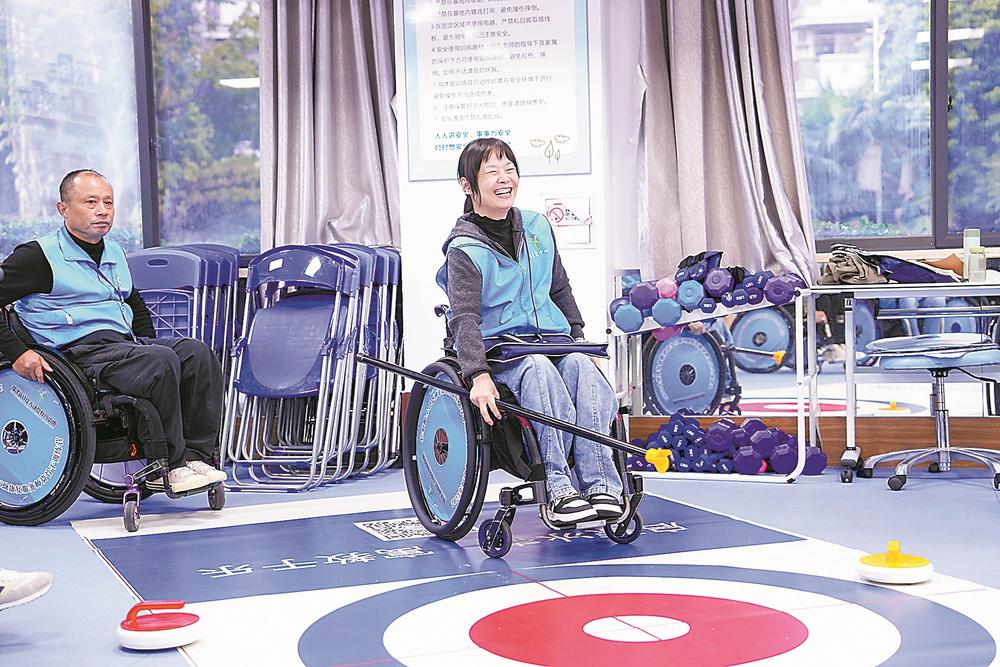 伤友在训练进行旱地冰壶运动,锻炼手眼协调能力。