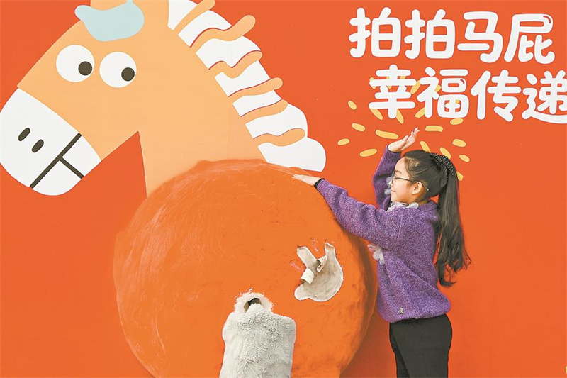 2月4日至5月5日,马舞新春——丙午马年全球生肖文化大联展在福建博物院展出,汇集数百幅以马文化为题材的文物与艺术品图片,和院藏80余件与马相关的主题文物同期展出。图为2月11日,小游客在展览门口的打卡处拍照。记者 施辰静 摄