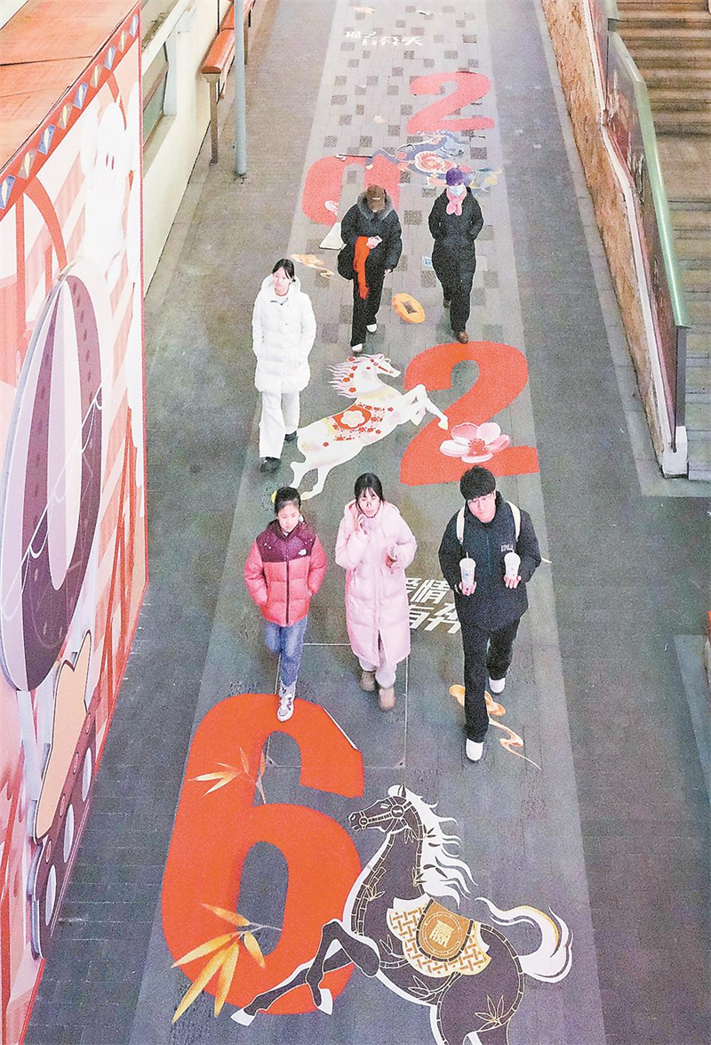 2月8日,福州烟台山商业漫步街区,市民漫步于绘有“2026”字样与奔马图案的道路。洪昊扬 摄