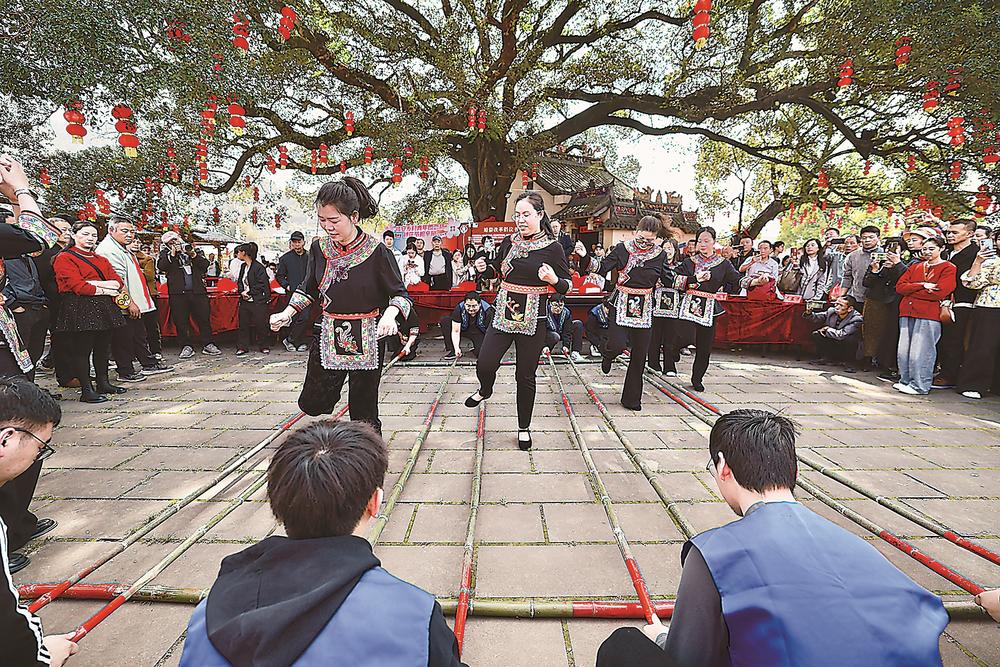 活动现场,《畲家山水谣》《十里桃花》《穆云桃花开》《竹竿舞》等精彩节目轮番上演,不少游客还在桃林中拍照留念,记录下春日盛景。“穆云的桃花开得特别美,我每年都来,不仅能欣赏到正宗的畲歌、平讲戏,还能体验畲族的特色民俗,玩得非常开心。”专程带着家人前来打卡的游客郑巧珍笑道。
