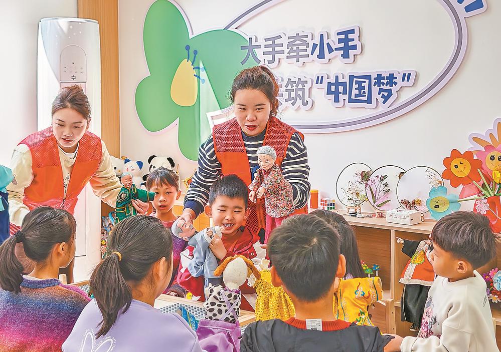 南昌社区“四点半课堂”里,孩子们学习布袋木偶的操控技巧。郑文典 摄