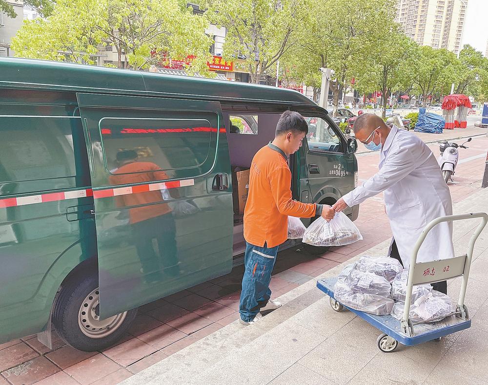 邮政快递现场取件,准备将药品配送至患者家中。