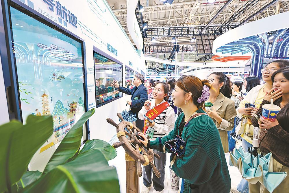4月29日,在第九届数字中国建设峰会福州马尾展区,中国船政文化景区邀请观众参与“数字+文旅”融合新场景的互动游戏。记者 施辰静 摄