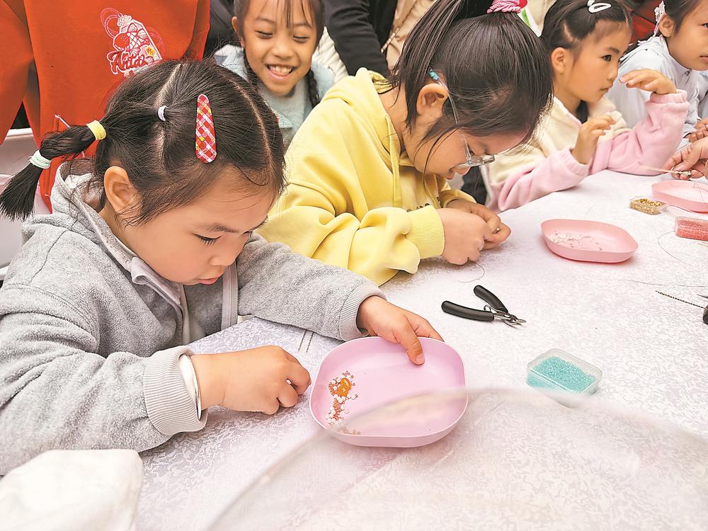 小朋友体验非遗戏曲头饰制作技艺。黄星榕 摄