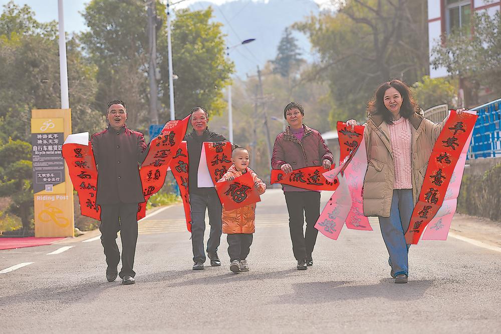 图为城厢镇园丁村村民兴高采烈地将春联领回家。(李国潮 摄)