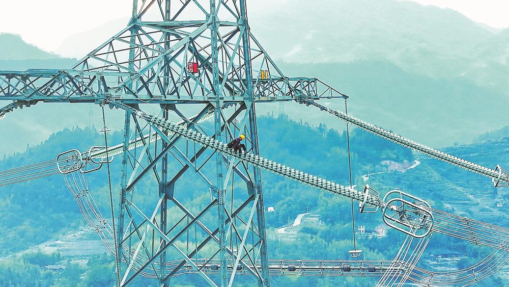 近日,福州-厦门1000千伏特高压交流工程252号铁塔上,3名检修人员在检查导地线挂点、绝缘子串及导线间隔棒外观。这是该工程2023年12月建成投运后的首次年度检修。