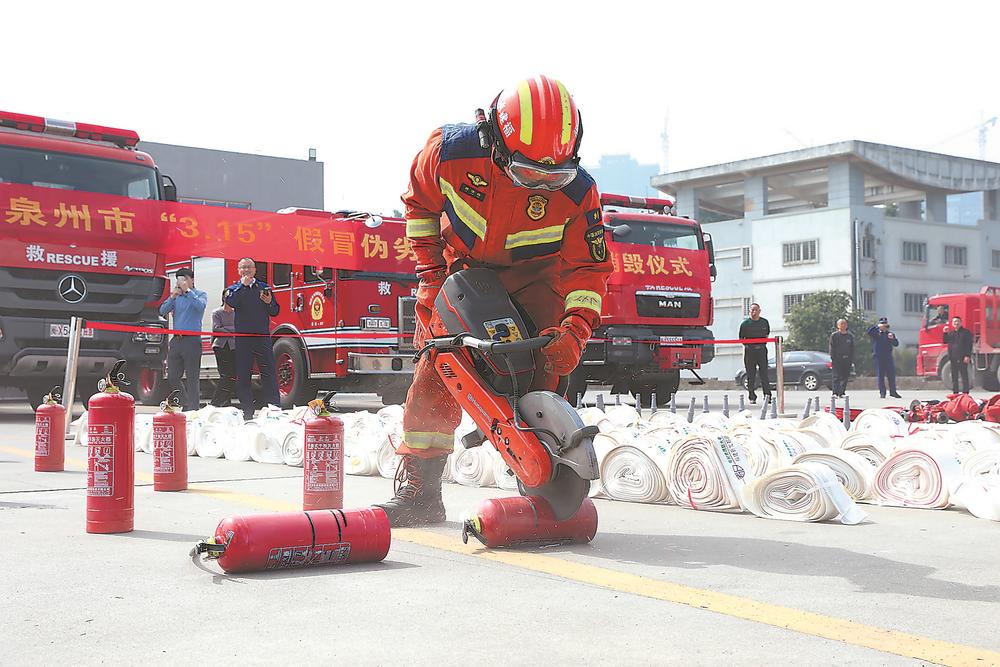 泉州是全国三大消防产品生产基地之一。据介绍,此次销毁的产品包括不合格的水带、直流水枪、灭火器、喷淋头等消防产品。(见习记者 庄钊滢 通讯员 黄阿兰 摄)