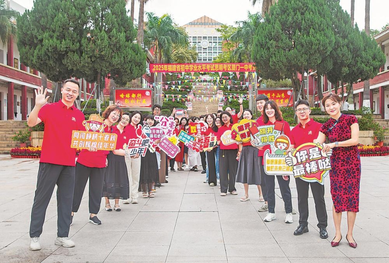 19日中考第一天,在厦门市思明区厦门一中考点,老师和家长举着各种鼓励的标语迎接考生。林旭东 摄