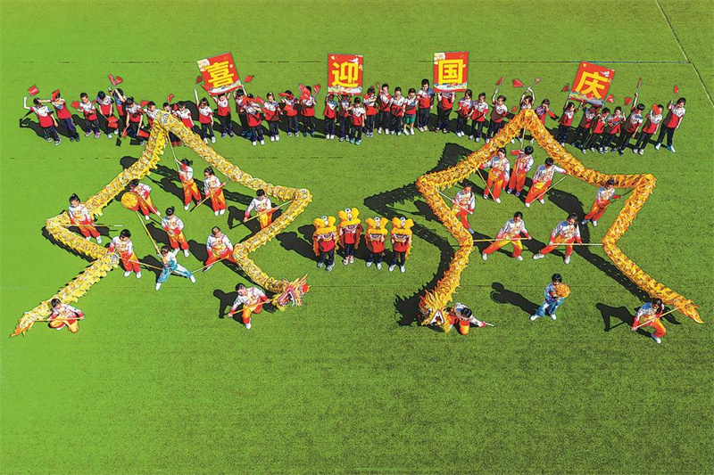 29日,福州市仓山区教师进修学校附属第一小学开展“喜迎国庆 祝福祖国”主题活动,师生通过舞龙舞狮表演、列队摆造型、与国旗合影等形式,表达对祖国的美好祝愿,喜迎国庆佳节。(谢贵明 摄)