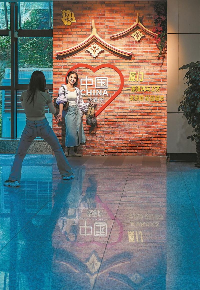 国庆来临,厦门地铁在沿线作主题氛围布置。图为市民在厦门地铁1号线的布置点留影。(林志杰 摄)