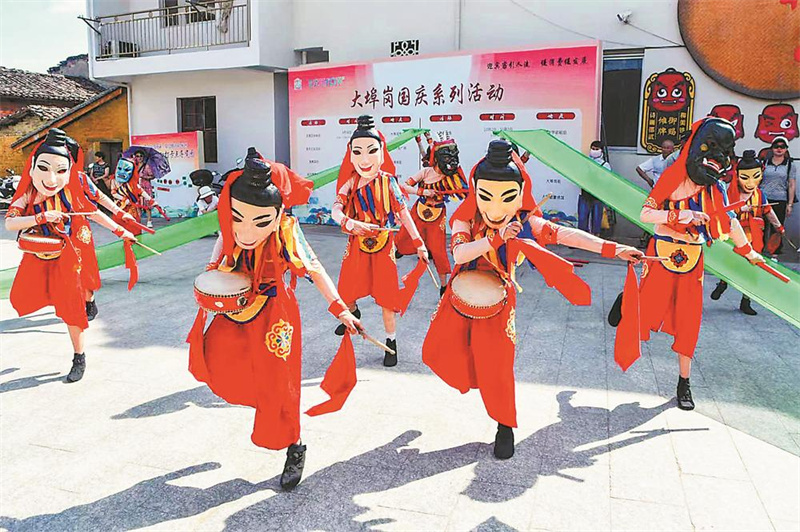 29日,邵武市大埠岗镇大埠岗村洋溢着喜庆祥和的节日气氛。“非遗匠人体验街区开街表演‘傩舞’”等节目轮番上演,吸引不少村民和游客驻足观看。(黄自棋 摄)