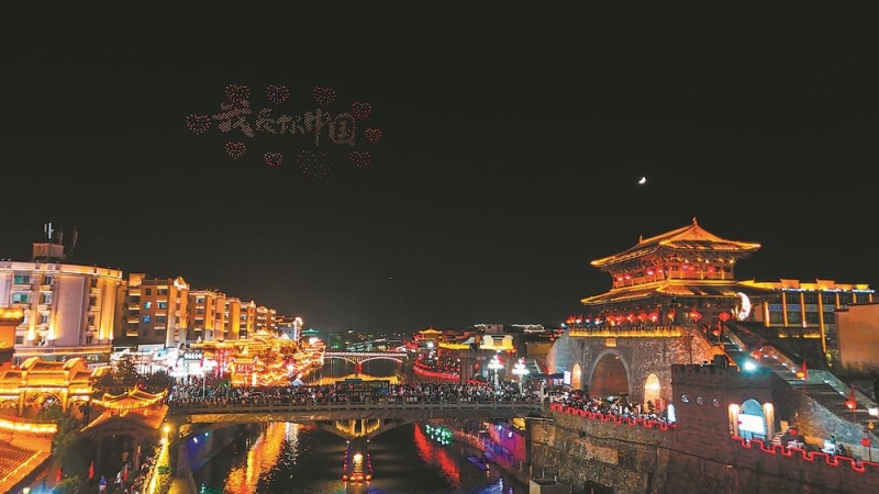 9月30日晚,长汀县举办特色文旅活动喜迎国庆,千架无人机编队上演高空烟花秀,花车巡游队伍穿城而过,吸引众多市民游客驻足观赏。(通讯员 李势明 记者 罗小春 摄)