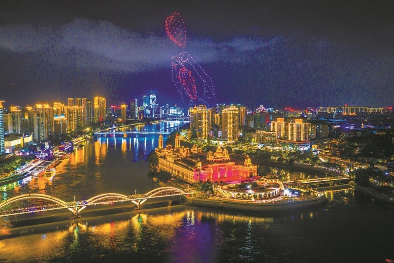 9月29日晚,位于福州市区闽江段的中洲岛举行无人机飞行表演,喜迎国庆、中秋双节。假日期间,这里将推出灯光秀、主题艺术市集、户外音乐节等活动。(通讯员 陈成才 摄)