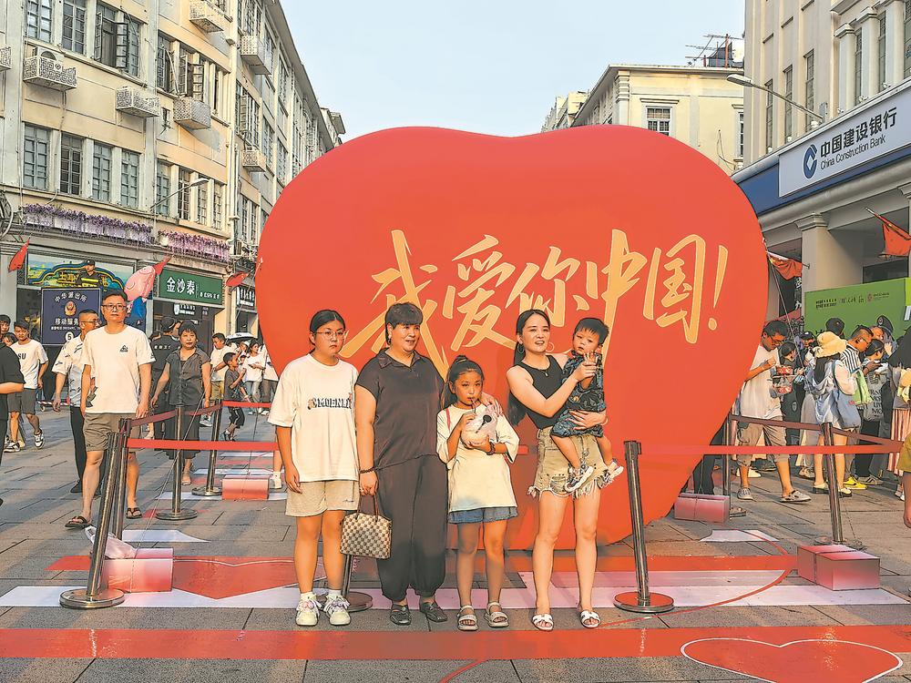 10月1日,游客在厦门中山路步行街的“我爱你中国”装置前合影留念。(记者 赵文娟 摄)