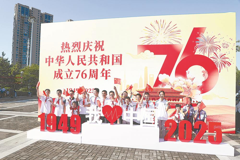 10月1日,在霞浦县福宁文化公园,当地中小学学生手举国旗合影。(记者 单志强 通讯员 朱世刚 摄)