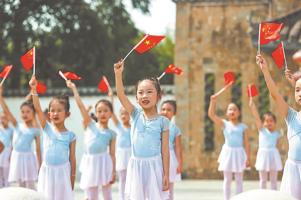 10月1日,松溪县梅口埠景区举行“载歌载舞庆国庆”快闪活动,孩子们手举国旗,共祝祖国好。(记者 许可欣 通讯员 王德锋 摄)