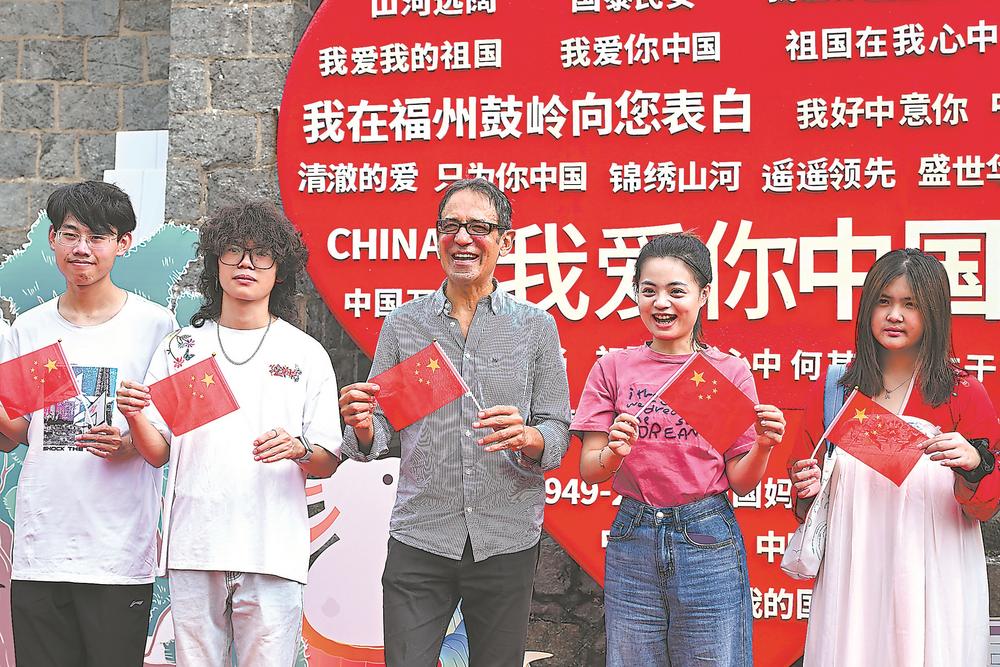 10月1日,福州鼓岭旅游度假区推出以“月满华诞 情聚鼓岭”为主题的2025鼓岭国庆假期特色活动,在万国公益社广场设立了“我爱你中国”大型心形打卡点,吸引中外游客前来拍照留念。(记者 游庆辉 摄)