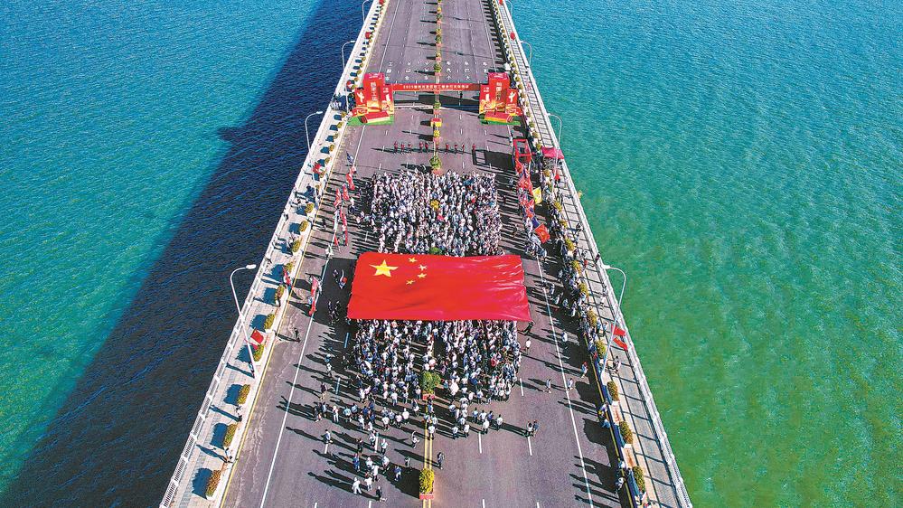 9月28日,漳州开发区56家企事业单位共2000余名职工齐聚双鱼岛大桥,开展健步行文体活动。活动期间,大家托举国旗,表达对祖国的热爱之情。(报业集团记者 杜正蓝 通讯员 林洁 摄)