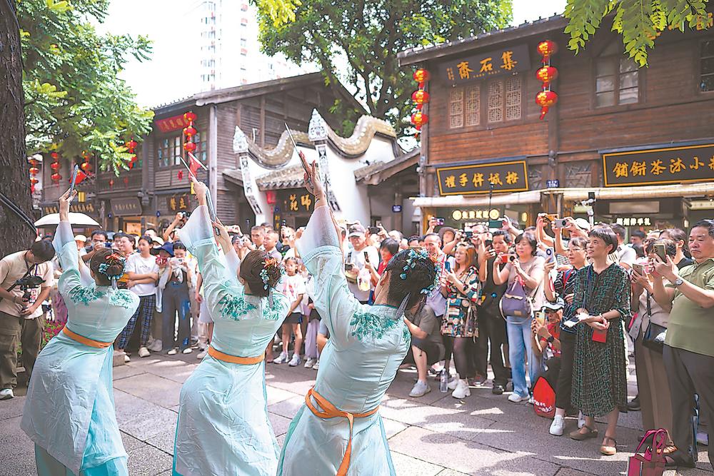 10月1日,在福州三坊七巷,由福州市闽都文化艺术中心演员带来的“三条簪”舞蹈表演吸引游客驻足观赏。(记者 施辰静 摄)
